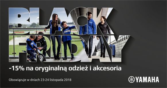 Każda osoba, która dokona zakupu oryginalnej odzieży lub akcesoriów Yamaha w dniach 23-24 listopada, na hasło „Yamaha Black Friday” otrzyma na nie rabat w wysokości 15%*. To świetna okazja, by już w ten piątek i sobotę odwiedzić najbliższy salon Yamahy, obejrzeć bogate kolekcje odzieży – prosto z torów wyścigowych Paddock Blue, klasyczną Revs czy linię Off-Road MX. W ofercie ubrania do jazdy jednośladem i do noszenia na co dzień – ciepłe czapki, pikowane kurtki, T-shirty dla całej rodziny, szeroki wybór akcesoriów motocyklowych i marine, a także gadżety idealne na mikołajkowe prezenty.